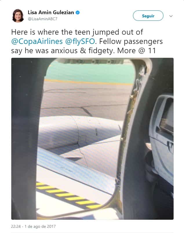 Os passageiros a bordo do voo da Copa Airlines vindo do Panamá ficaram chocados quando ele abriu a porta e pulou para a pista. “Parecia que ele estava voando para fora, como se estivesse realmente muito rápido”, disse a passageira Sophia Gibson à KNTV. Logo após o incidente, uma comissária se posicionou na frente da saída para que ninguém mais cometesse a infração.