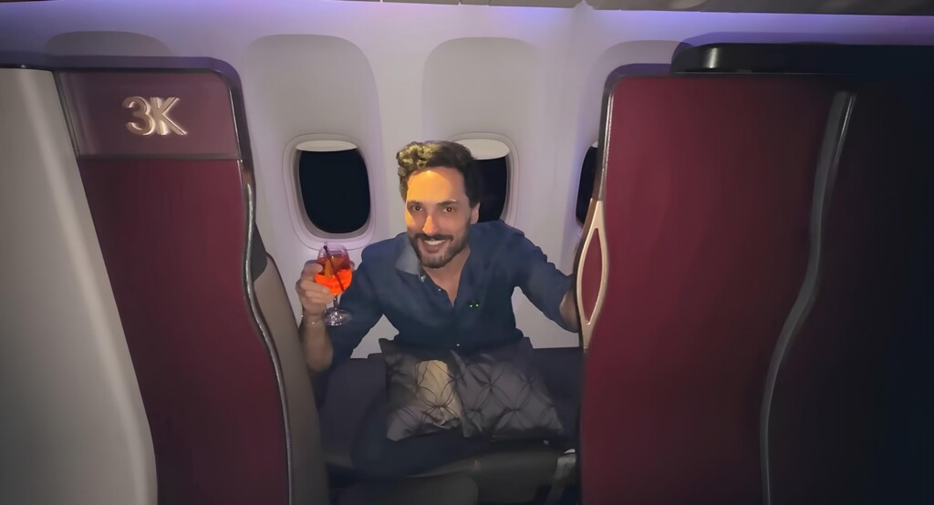 Estamos voando de executiva em um Boeing 787-900 Dreamliner. Esta aeronave tem capacidade para 298 passageiros, sendo 240 assentos na Economy (com TV individual e bebidas alcóolicas inclusas), 21 assentos na Premium Economy e 30 na Executiva – que tem configuração 1 – 2 – 1, em que todos têm acesso livre ao corredor.