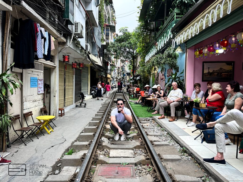 Outro lugar interessante é a Hanoi Train Street, uma linha que passa pelo meio da cidade. Aliás, parece muito com aquela linha de trem da Tailândia. É o mesmo esquema, quando o trem chega, o pessoal afasta tudo, passa o trem, e depois volta tudo de novo. É uma loucura porque o trem passa muito perto das casas, das pessoas.